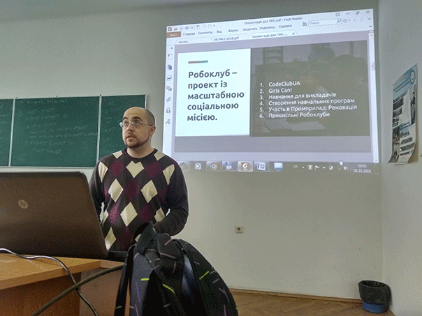 1 листопада 2018 року на факультеті математики та інформатики ДВНЗ “Прикарпатський національний університет імені Василя Стефаника” відбулася знакова зустріч студентів освітніх спеціальностей (“Середня освіта (Інформатика)” та “Середня освіта (математика)” з учасниками команди Івано-Фанківського Робоклубу (http://www.roboclub.if.ua/). Засновник організації Сергій Никоноров розповів про те, як виникла ідея створення цієї організації, її історію та основні напрямки діяльності.