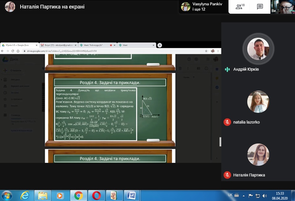 8 квітня відбулося секційне засідання засобами Hangouts Meet за участю студентів магістратури “Середня освіта (Математика)” та викладачів кафедри математики та інформатики і методики навчання. Було заслухано доповіді 18 магістрантів спеціальності “Середня освіта (Математика)” денної та заочної форми навчання. Кожен доповідач після виступу відповідав на запитання, після чого студенти та викладачі обмінялися враженнями щодо доповіді. Учасників конференції зацікавили дослідження Рендзяк Діани, Партики Наталії, Радул Андріани, Чоп’юка Юрія, Лазорко Наталії, Ситник Анастасії, Білінкевича Назара та інших студентів. Онлайн засідання тривало майже 3 години.