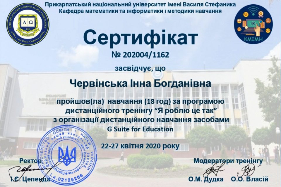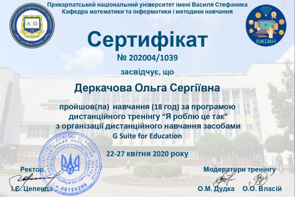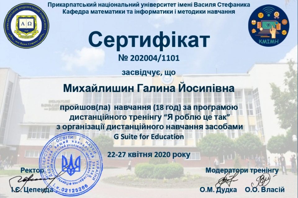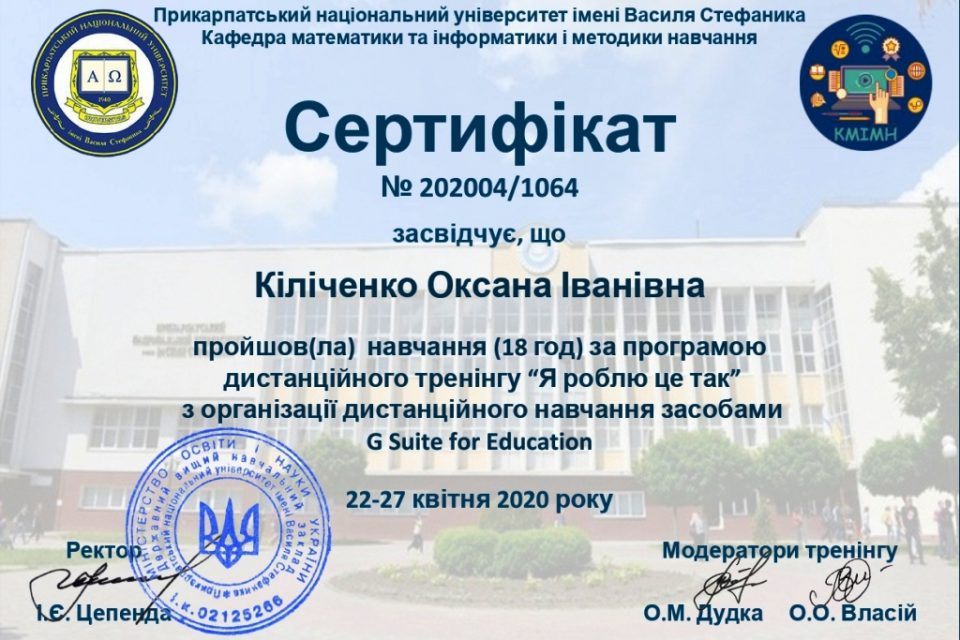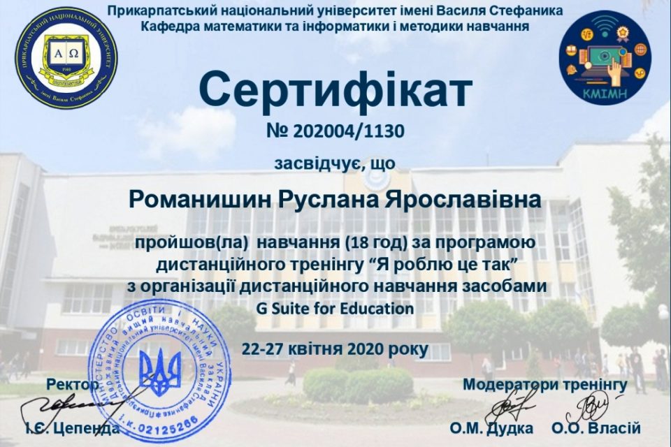 Тренери дистанційного тренінгу – доцентки кафедри математики та інформатики і методики навчання Ольга Дудка та Олеся Власій, зокрема, акцентували увагу на корпоративній культурі при організації дистанційного навчання у Прикарпатському університеті в умовах карантину. Цікаві вправи, домашні завдання та командні лабораторні роботи забезпечили позитивну онлайн енергетику та досягнення учасниками очікуваного результату – підвищення рівня педагогічної майстерності у сфері цифрових технологій у процесі викладання науково-педагогічних працівників Прикарпатського університету, що підтверджено відповідними сертифікатами.