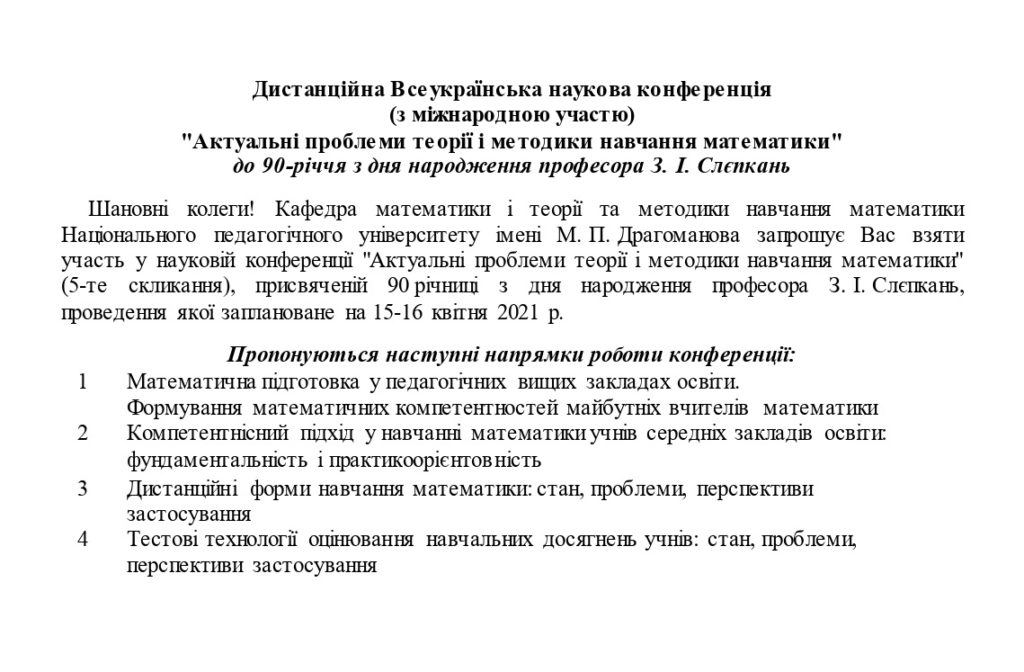 Конференції, наукові журнали, монографії Дистанційна Всеукраїнська наукова конференція (з міжнародною участю) “Актуальні проблеми теорії і методики навчання математики” до 90-річчя з дня народження професора З. І. Слєпкань. Детальніша інформація…